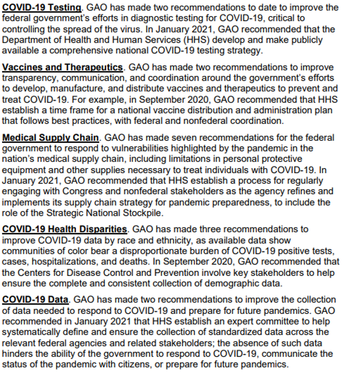 GAO has made 44 recommendations for agencies and four matters for congressional consideration in its comprehensive series of bimonthly reports on the federal response to COVID-19 over the last year. Of these 44 recommendations, 16 relate to the following public health topics: