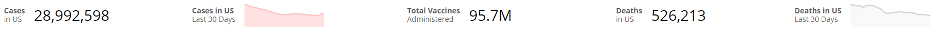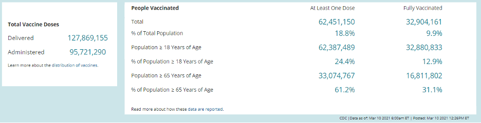 CDC has posted COVID-19 data as of 6am on March 10, 2021: