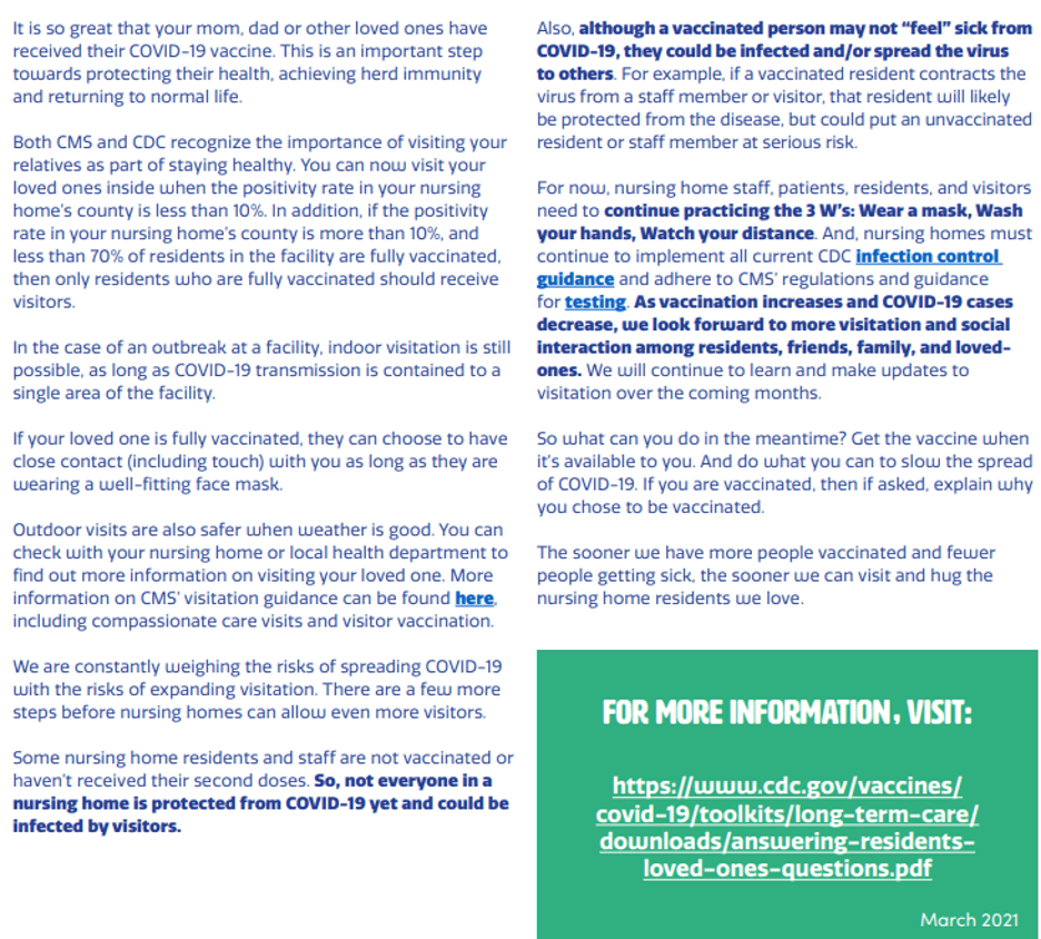 CMS provided the graphic as well as information that you can share with families and friends anxious to visit. I encourage you to look at this, so you don’t need to reinvent the wheel! It could be used on your facility’s website, in an email to families, etc. Note that the graphic is available in both English and Spanish.