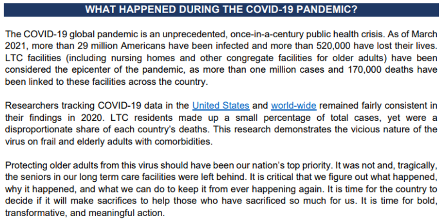 “The COVID-19 pandemic has exposed and exacerbated long-standing challenges impacting the long term care (LTC) profession. The American Health Care Association (AHCA) and LeadingAge are dedicated to learning from this experience, renewing our commitment to our seniors and offering solutions that will improve the quality of care in our nation’s nursing homes.”