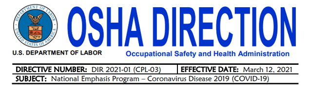 “This Direction describes policies and procedures for implementing a National Emphasis Program (NEP) to ensure that employees in high-hazard industries or work tasks are protected from the hazard of contracting SARS-CoV-2 (severe acute respiratory syndrome coronavirus 2), the cause of Coronavirus Disease 2019 (COVID-19). The NEP augments OSHA’s efforts addressing unprogrammed COVID-19-related activities, e.g., complaints, referrals, and severe incident reports, by adding a component to target specific high-hazard industries or activities where this hazard is prevalent. The NEP targets establishments that have workers with increased potential exposure to this hazard, and that puts the largest number of workers at serious risk. In addition, this NEP includes an added focus to ensure that workers are protected from retaliation, and are accomplishing this by preventing retaliation where possible, distributing anti-retaliation information during inspections, and outreach opportunities, as well as promptly referring allegations of retaliation to the Whistleblower Protection Program.”
