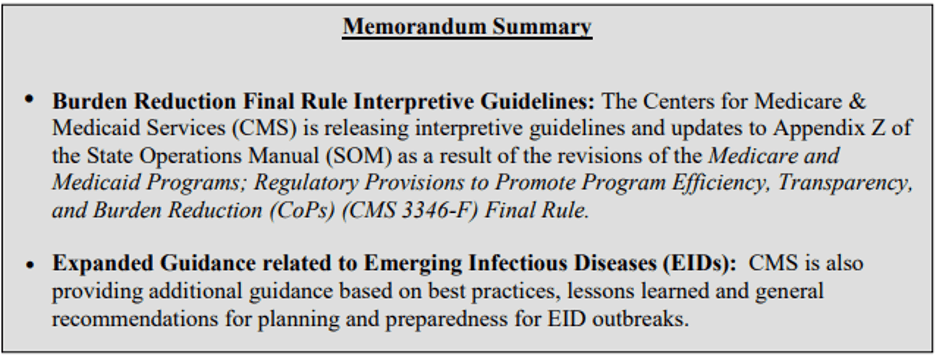 “In light of the coronavirus disease 2019 (COVID-19) public health emergency (PHE), CMS is expanding the Emergency Preparedness Interpretive Guidelines to further expand on best practices, lessons learned, and planning considerations for EIDs.”