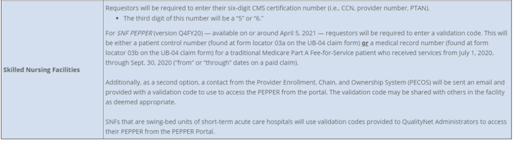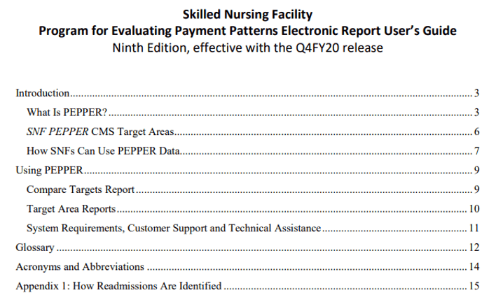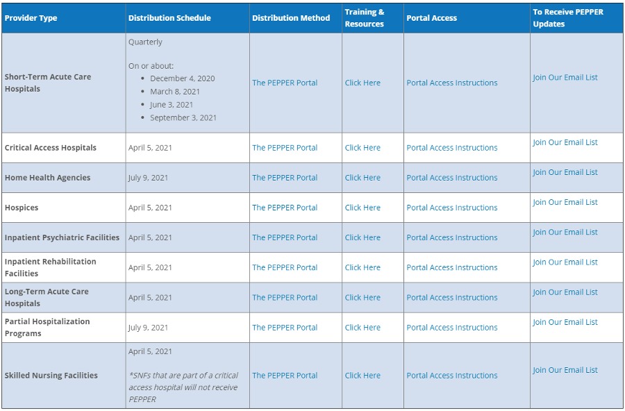 On March 30, 2021, the SNF PEPPER User’s Guide, Ninth Edition was posted to the PEPPER Resources website. This is a 15-page Users Guide. Please download it and reference it when reviewing your report. On or about April 5, 2021, your SNF’s PEPPER report will be available for you to download and carefully review. This is not a report you/your team can afford to ignore!