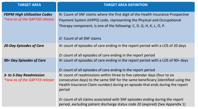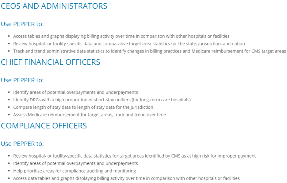 Remember that PEPPER does not identify the presence of improper payments, but it can be used as a guide for auditing and monitoring efforts. A SNF can use PEPPER to compare its claims data over time to identify areas of potential concern and to identify changes in billing practices.