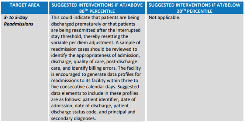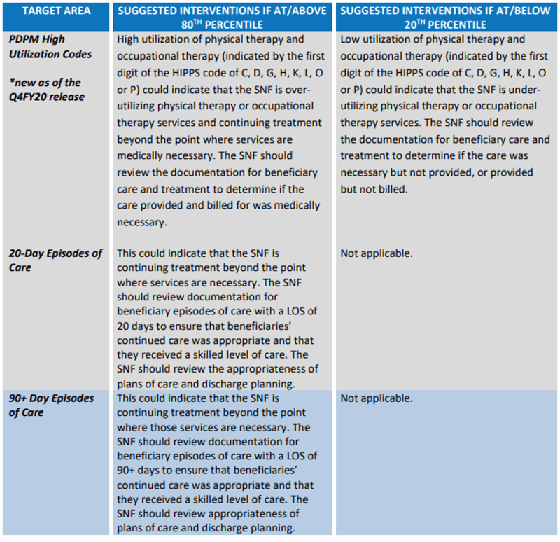These PEPPER target areas were identified by CMS as being potentially at risk for improper Medicare payments. A high target area percent does not necessarily indicate the presence of improper payment or that the provider is doing anything wrong; however, under these circumstances, providers may wish to review their medical record documentation to ensure that the services their beneficiaries receive are appropriate and necessary, as well as to ensure that the documentation in the medical record supports the level of care and services for which they have received Medicare reimbursement.