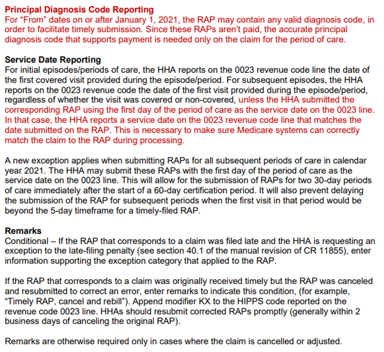 This MLN Matters Article is for Home Health Agencies (HHAs) who wish to bill Medicare Administrative Contractors (MACs) for services provided to Medicare beneficiaries. This article informs you about the implementation of the Calendar Year (CY) 2021 Home Health (HH) Request for Anticipated Payment (RAP) payment policies. Please be sure your billing staffs are aware of these changes.