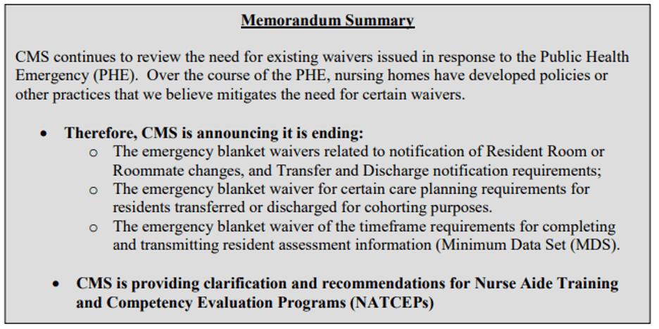 This is an important QSO memorandum for all LTC providers so review it carefully! CMS is ending select emergency blanket waivers.