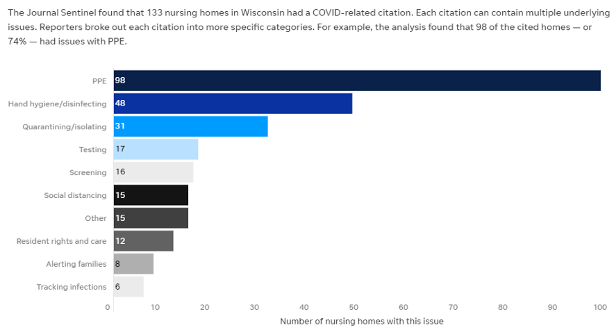 This investigative piece was posted on April 9, 2021. It includes access to a “database to look up skilled nursing facilities that were cited for coronavirus-related deficiencies. You can see the severity of the deficiency (ranked A to L, from most minor to most severe) as well as the general type of deficiency, as categorized by Journal Sentinel reporters.” The database includes the CMS-2567 reports detailing the deficiencies.