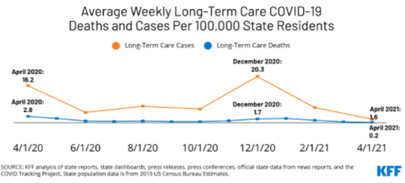 “A data note looking at state-reported LTCF data finds COVID-19 deaths and cases among residents and staff of long-term care facilities have fallen dramatically since vaccinations began in December, with deaths declining by nearly 89 percent and cases declining by nearly 92 percent as of April 2021.