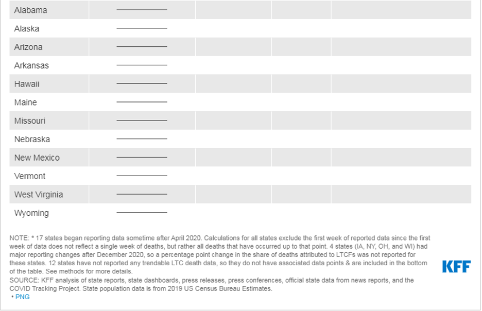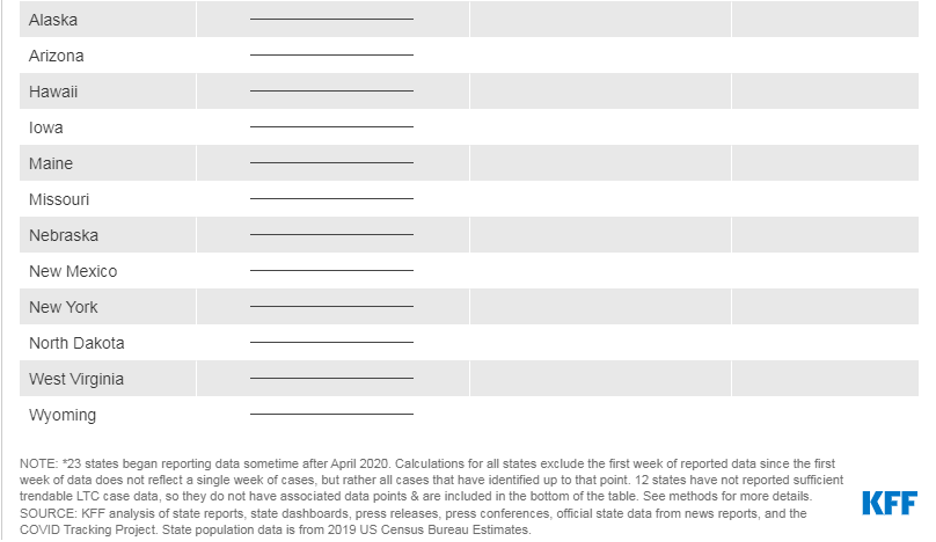 - Of the 39 states (38 states plus DC) for which we can trend COVID-19 deaths in LTCFs, 21 states reported an all-time low death rate in April 2021. Five states reported zero LTCF deaths per 100,000 state residents in April 2021, a rounded value that represents a very small number of LTCF deaths in those states (Table 1 and Appendix Table 1).