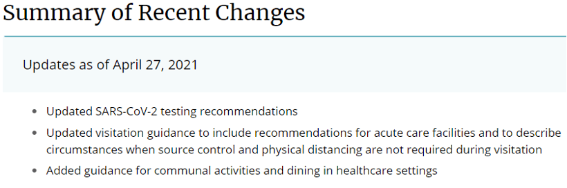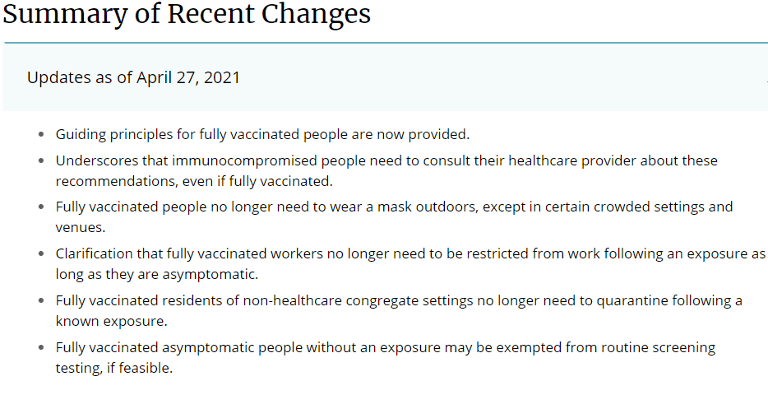 CDC updated both the recommendations for fully vaccinated people and Healthcare Infection Prevention and Control Recommendations in Response to COVID-19 Vaccination on April 27, 2021.