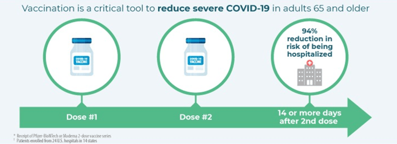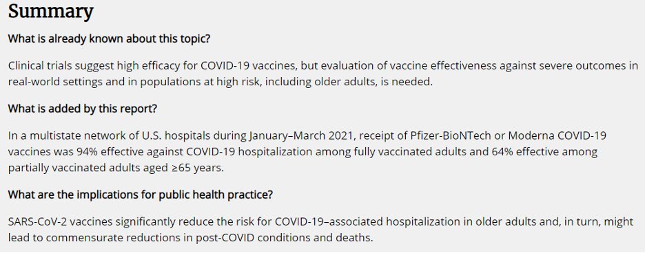 “In the current report, Pfizer-BioNTech and Moderna vaccine products were equally represented, and approximately one half of the patients were aged ≥75 years, providing evidence of real-world effectiveness of both vaccines against an important measure of severe COVID-19 in older adults. Moreover, in assessing the impact of receiving only a single dose, no significant vaccine effectiveness <14 days after the first dose of a SARS-CoV-2 vaccine was detected. This suggests that bias is unlikely in the primary estimates of vaccine effectiveness from partial and full vaccination. This also highlights the continued risk for severe illness shortly after vaccination, before a protective immune response has been achieved and reinforces the need for vaccinated adults to continue physical distancing and prevention behaviors, such as use of face masks and recommended hand hygiene at least 14 days after the second dose of a 2-dose vaccine. The findings suggest that SARS-CoV-2 vaccines can reduce the risk for COVID-19–associated hospitalization and, as a consequence of preventing severe COVID-19, vaccination might have an impact on post-COVID conditions (e.g., “long COVID”) and deaths.” (Bolding added by me.)