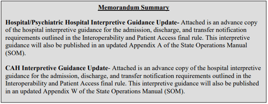CMS issued QSO-21-18-Hospitals/CAHs on Friday, May 7, 2021. This is an advance copy of Interoperability and Patient Access Rule – Admission, Discharge, and Transfer Notifications for Hospitals, Psychiatric Hospitals, and Critical Access Hospitals (CAHs) Interpretive Guidance.