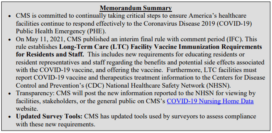 For additional details on today’s rule, visit here: https://www.federalregister.gov/public-inspection/2021-10122/medicare-and-medicaid-programs-covid-19-vaccine-requirements-for-long-term-care-facilities-and.+