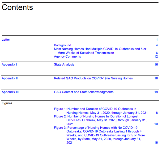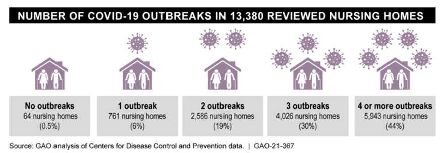 (GAO) looked at the frequency and duration of COVID-19 outbreaks in nursing homes from May 2020 through January 2021. A nursing home outbreak begins when a nursing home reports a new case among residents or staff and ends when the home has two consecutive weeks with no new cases.