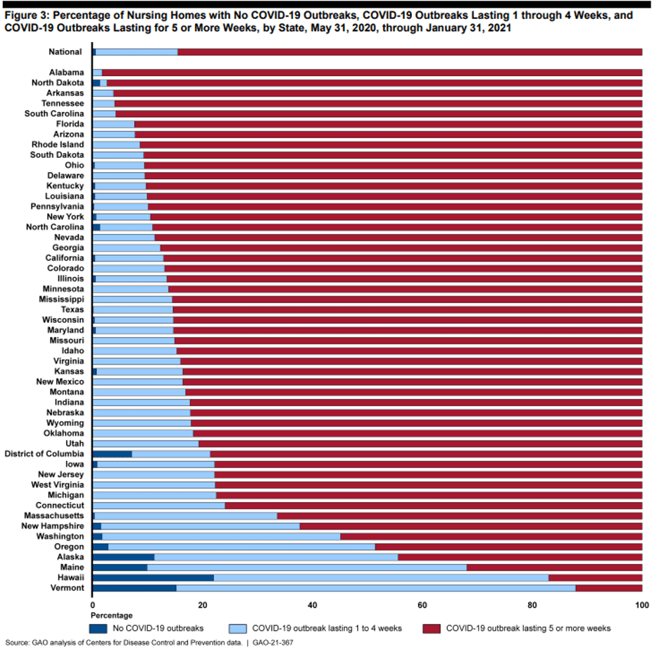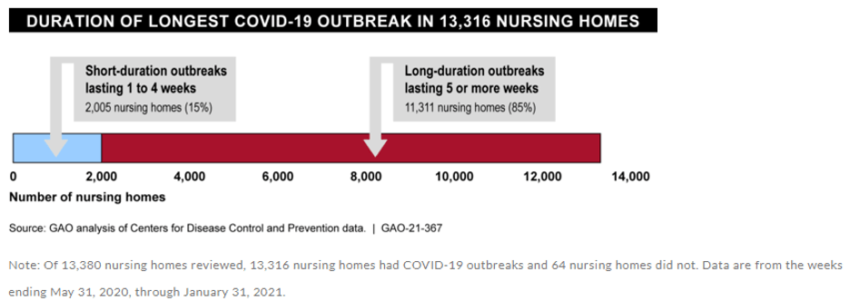 - 85% of the nursing homes (GAO) reviewed had an outbreak lasting 5 or more weeks.”