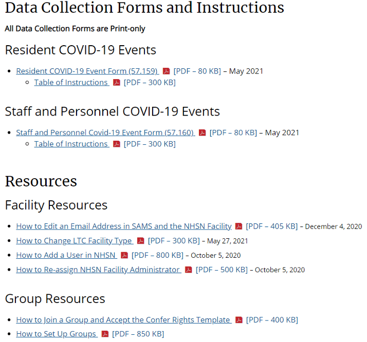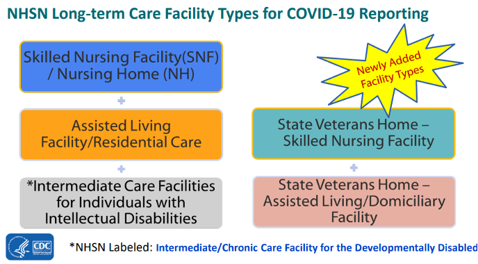 The NHSN Long-term Care Facility Component supports the nation’s COVID-19 response through the LTCF COVID-19 Module. Facilities eligible to report data to NHSN’s COVID-19 Module include nursing homes/skilled nursing, long-term care for the developmentally disabled, and assisted living. In response to H.R. 7105 – Veterans Healthcare and Benefits Improvement Act of 2020, NHSN created a surveillance tool to enable mandated reporting of resident and staff-level data to NHSN and the Veterans Health Administration (VHA).