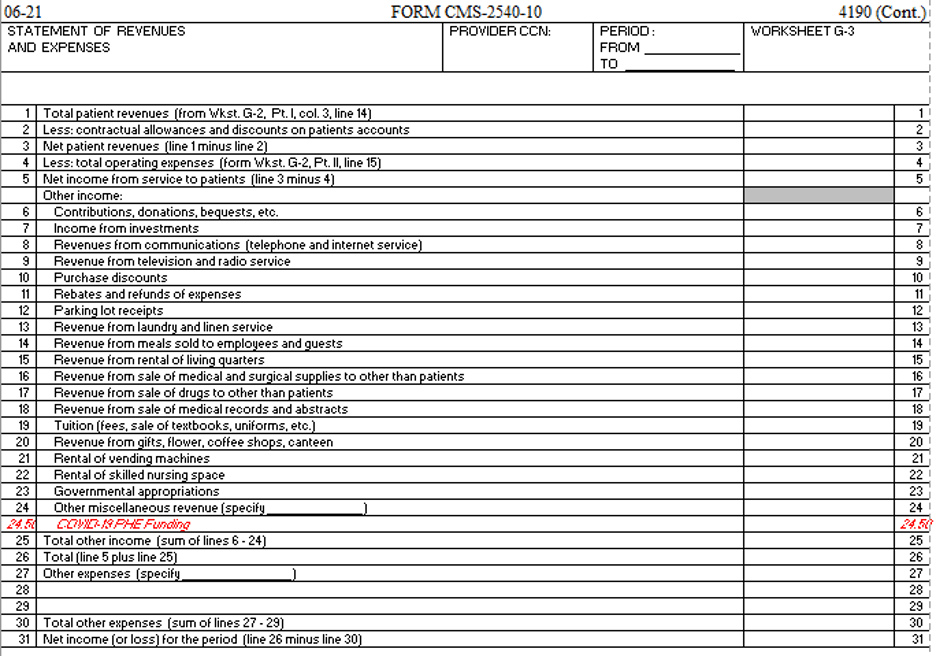 - Added line 24.50, for the SNF to report COVID-19 Public Health Emergency (PHE) funding in accordance with COVID-19 Frequently Asked Questions (FAQs) on Medicare Fee-for-Service (FFS) Billing, V. Cost Reporting, question 2; https://www.cms.gov/files/document/03092020-covid-19-faqs-508.pdf.