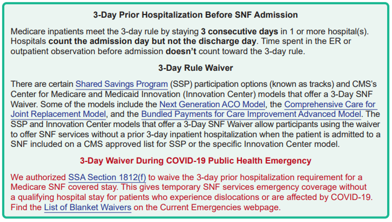 Skilled Nursing Facility 3-Day Rule Billing Medicare Learning Network fact sheet: Added information on temporary emergency coverage without a qualifying hospital stay due to the COVID-19 public health emergency.