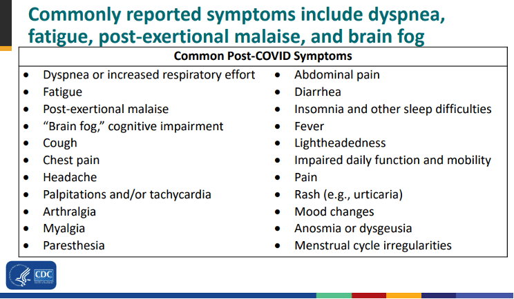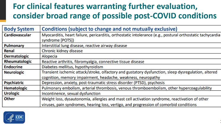 On June 17, 2021, I blogged on the CDC’s update of interim guidance on the subject of evaluating and caring for patients with post-COVID conditions. COCA (CDC Clinician Outreach and Communication Activity) also hosted a webinar on June 17th on the same subject. It was an excellent webinar. If you missed that webinar or want to listen again, it’s now available here. It’s 64 minutes in length. The corresponding handout is found here. Below are 2 slides from that presentation: