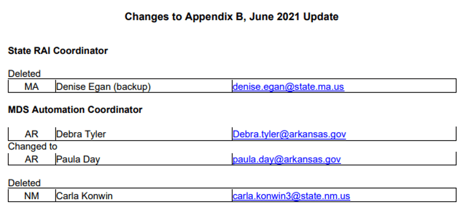 CMS posted the latest update to Appendix B of the RAI User’s Manual on Monday, June 21, 2021. The June update (dated June 24, 2021) of Appendix B to the RAI 3.0 User’s Manual contains changes to the list of State RAI Coordinators, MDS Automation Coordinators, RAI Panel members, and CMS Locations, contacts. To ensure accurate formatting, use a current version of Adobe Acrobat Reader to view this PDF. Web-based or mobile browser plug-ins may affect how the file is displayed. The change document is found here with these changes identified: