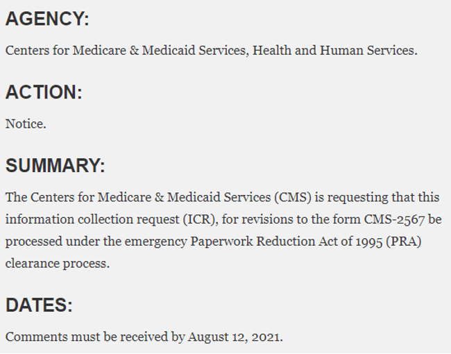 On July 13, 2021, the Federal Register published 2021-14866. (CMS filed the notice on July 12, 2021.) This notice is for hospice programs and their survey process and involves the use of CMS-2567. Note that there is a 1-month comment period.