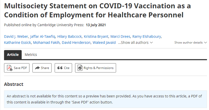 Mandating COVID-19 vaccination is certainly a hot topic these days just as motivating healthcare employees to get vaccinated. You may have already made up your mind on what should be done. If you answered yes, no or unsure, you may want to read the Multisociety Statement on COVID-19 Vaccination as a Condition of Employment for Healthcare Personnel, posted on July 13, 2021. [NOTE: this hyperlink takes you to a general website for Cambridge University Press. Once there, look for the Save PDF link so access the article/statement itself.] The statement is 46 pages in length and is worth the read.