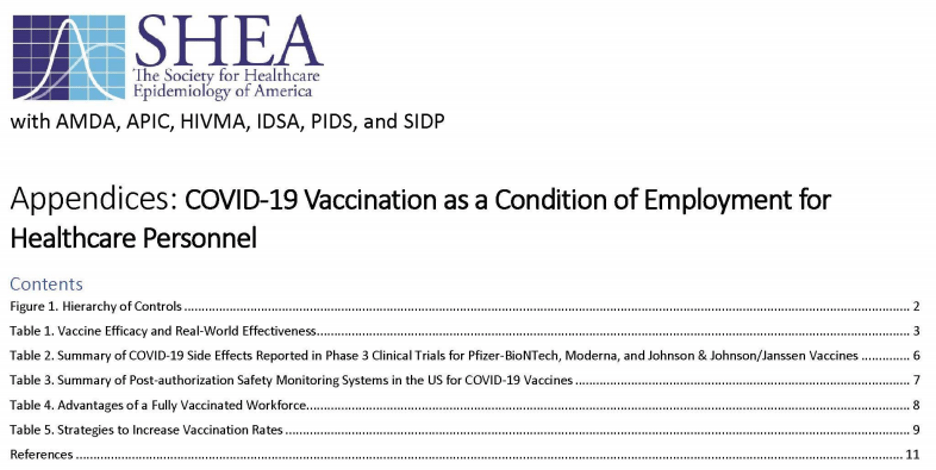 This consensus statement by the Society for Healthcare Epidemiology of America (SHEA) and The Society for Post-Acute and Long-Term Care Medicine (AMDA), The Association for Professionals in Epidemiology and Infection Control (APIC), the HIV Medicine Association (HIVMA), the Infectious Diseases Society of America (IDSA), the Pediatric Infectious Diseases Society (PIDS), and the Society of Infectious Diseases Pharmacists (SIDP), recommends that COVID-19 vaccination should be a condition of employment for all healthcare personnel. Exemptions from this policy apply to those with medical contraindications to all COVID-19 vaccines available in the United States and other exemptions as specified by federal or state law. The consensus statement also supports COVID-19 vaccination of non-employees functioning at a healthcare facility (for example, students, contract workers, volunteers, etc.).