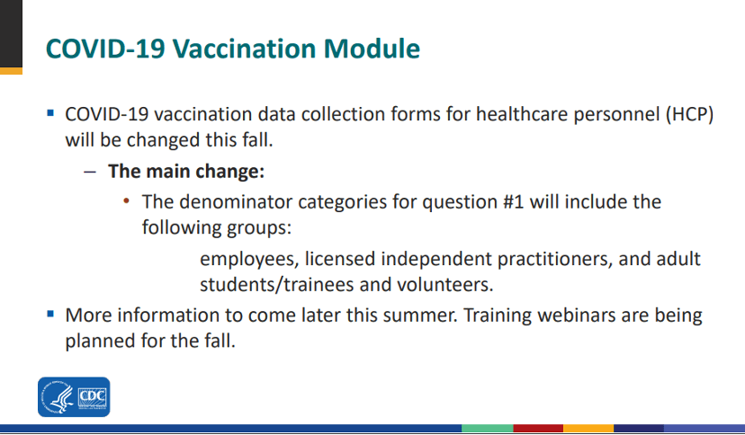 If you missed the July 12, 2021 NHSN webinar with the information on the upcoming modifications to the Facility COVID-19 Module, NHSN has posted the 30-slide handout.