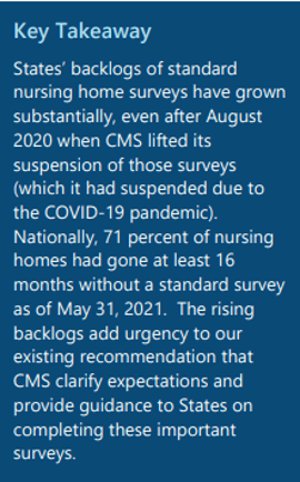 OIG Conclusion: “Backlogs of standard surveys of nursing homes need CMS’s attention. Our updated analysis underscores the importance and urgency of our previous recommendation to CMS to clarify expectations for States to complete backlogs of standard surveys, including by issuing guidance on prioritization of surveys and required timeframes to complete these backlogs. In its response to this recommendation in our report, issued in December 2020, CMS said it will continue working with States on how to address these backlogs. We encourage CMS to take the steps described above to implement this recommendation and help States provide needed oversight of nursing homes.”