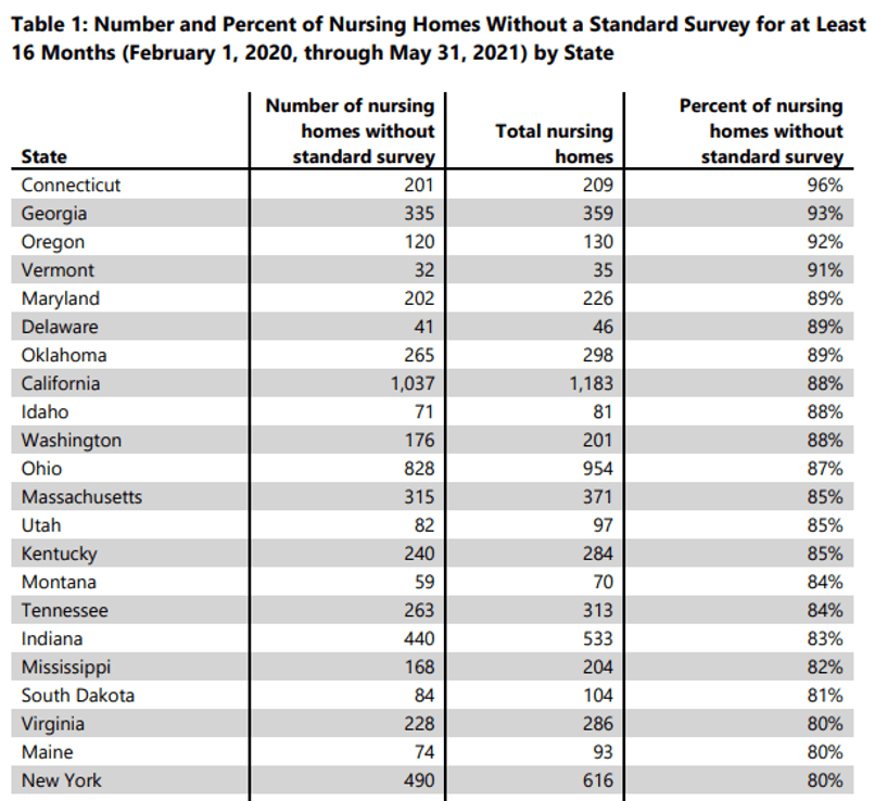 OIG Finding: “Nationally, 71 percent of nursing homes (10,913 of 15,295) had gone at least 16 months without a standard survey as of May 31, 2021. By State, the backlogs for standard surveys ranged from 22 percent to 96 percent.”