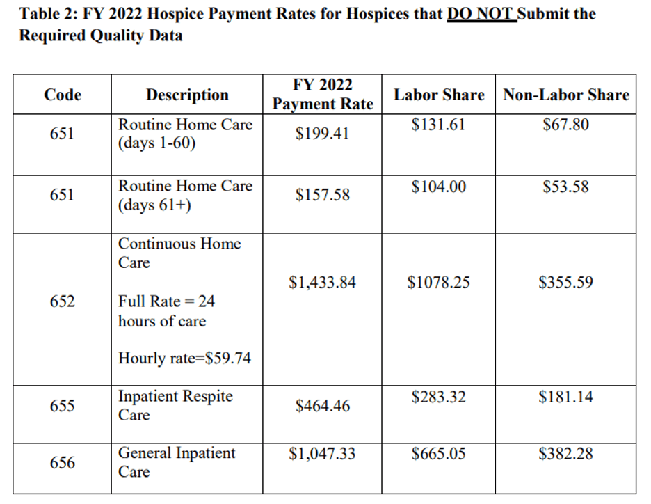 - The FY 2022 Hospice final rule revised the labor shares used to wage-adjust hospice payments for each level of care. The revised labor share for Routine Home Care is 66.00 percent and corresponding the non-labor share is 34.00 percent. The revised labor share for Continuous Home Care is 75.20 percent and the corresponding nonlabor share is 24.80 percent. The revised labor share for Inpatient Respite Care is 61.00 percent and the corresponding non-labor share is 39.00 percent. The revised labor share for General Inpatient Care is 63.50 percent and the corresponding non-labor share is 36.50 percent.