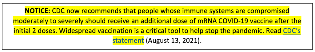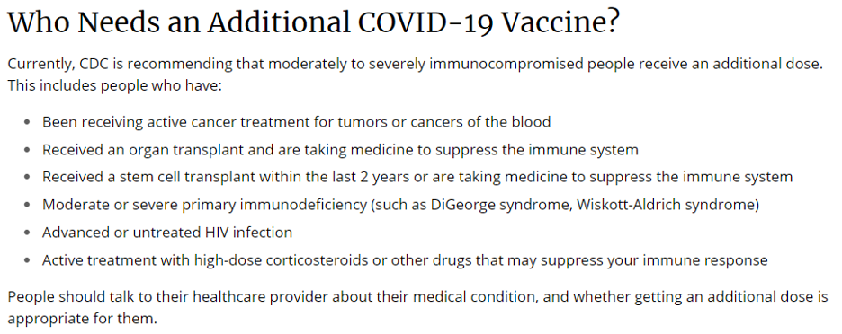 This CDC website – COVID-19 Vaccines for Moderately to Severely Immunocompromised People – was updated August 16, 2021.