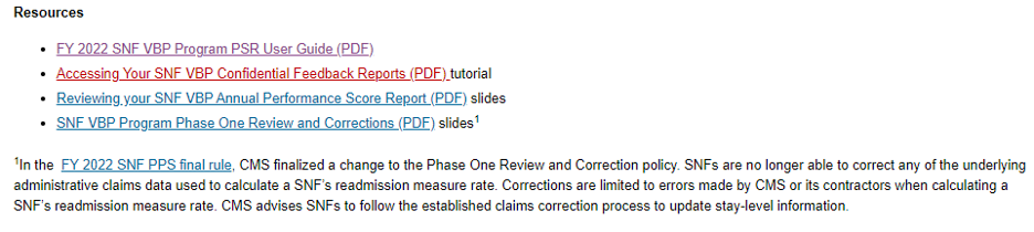 More information on the SNF VBP Program, including the Program’s scoring methodology, confidential feedback reports, public reporting efforts, and R&C process, is available on the SNF VBP Program webpage on CMS.gov.