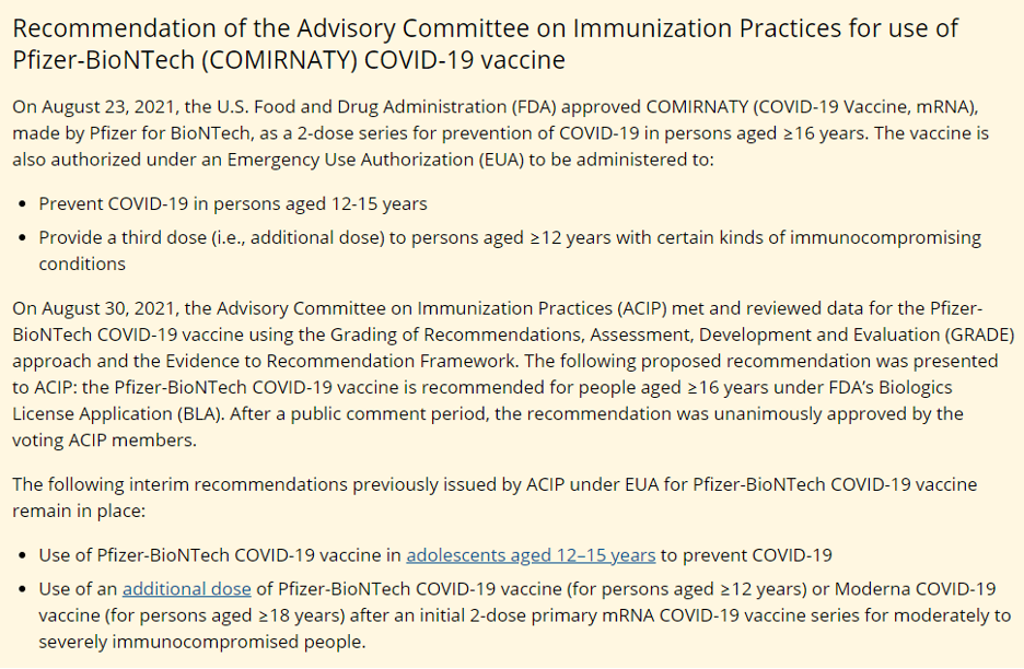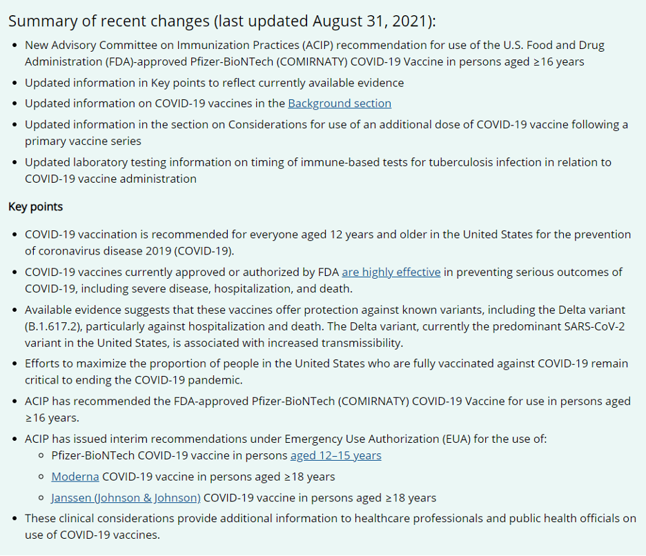Interim Clinical Considerations for Use of COVID-19 Vaccines Currently Approved or Authorized in the United States was updated August 31, 2021.