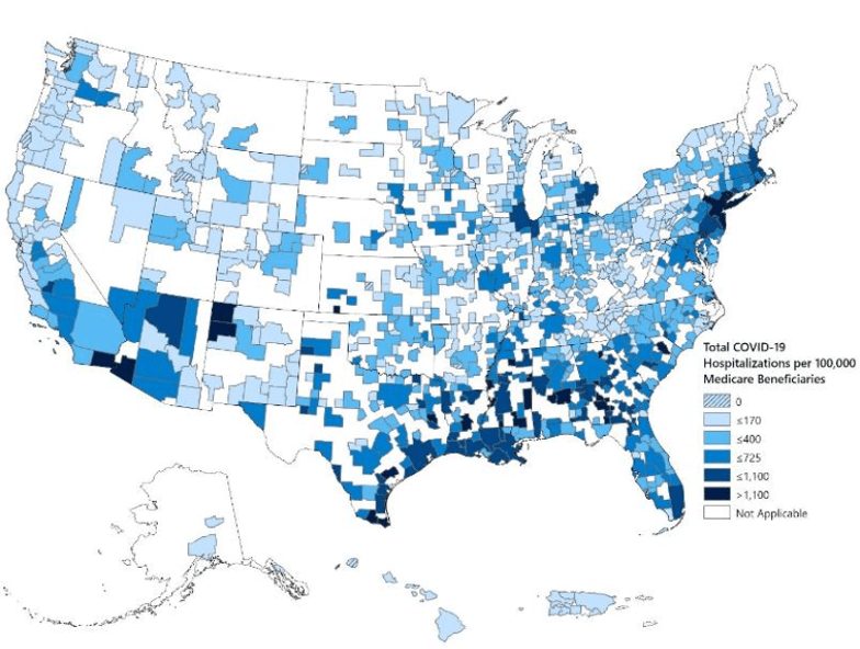 This is the COVID-19 Hospitalizations Interactive Map that “is a supplement to the OIG report Medicare Beneficiaries Hospitalized With COVID-19 Experienced a Wide Range of Serious, Complex Conditions. The interactive map tracks changes in the rate of hospitalizations of Medicare beneficiaries with COVID-19 by locality from April through July of 2020. It illustrates how the rates of Medicare beneficiaries needing hospitalization can surge and decline over time across localities.”