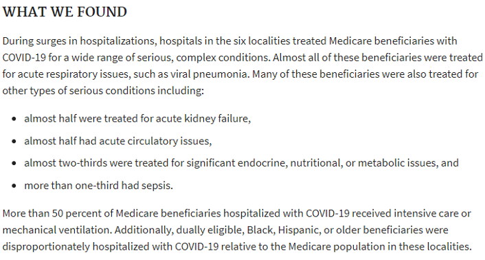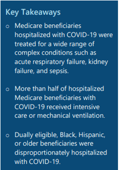“The complex needs of hospitalized Medicare beneficiaries—combined with surges in hospitalizations-may create substantial challenges in meeting the needs of these patients, particularly in light of the staffing and other problems that hospitals have reported. Gaining a better understanding of Medicare beneficiaries hospitalized with COVID-19—including the conditions for which they were being treated and demographic characteristics—can assist Federal, State, and local efforts in the COVID-19 pandemic and may be used to provide additional guidance to hospitals. This information can also help hospitals, physicians, and other practitioners better prepare for the complex and resource-intensive care needs of Medicare beneficiaries with COVID-19, which may be particularly important during continued surges of the virus. CMS can also use this information to identify beneficiaries who are particularly vulnerable to hospitalization as well as to understand the needs of these beneficiaries during their hospitalizations. In addition, this analysis shows that Medicare claims data can be used to enhance our knowledge of the treatment of COVID-19 and help inform additional research efforts.”