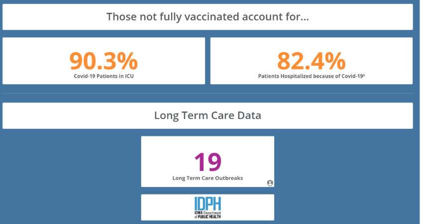 On a personal note, I always check my home state of Iowa to see how we’re doing. This latest posting shows that out of 99 counties in Iowa, only 2 are green with 31 showing yellow with this report. The rest of the counties (2/3 of the state at 66) are red. Last week, we had 3 green counties with 41 showing yellow, leaving a bit over half as red at that point in time. Going the wrong direction Iowans! 64.1% of Iowans are fully vaccinated with 66.7% aged 12 and older having at least one dose. This information as well as the graphic below is current as of September 5, 2021.[1]