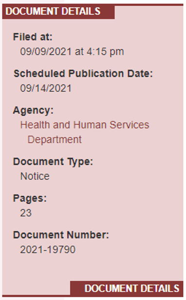 This HHS (Health and Human Services) Amendment Notice is scheduled to be published in the Federal Register on Tuesday, September 14, 2021: