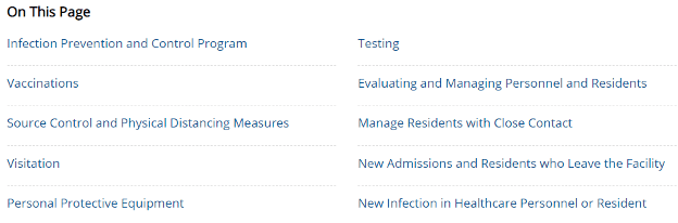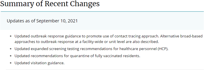 CDC has updated Interim Infection Prevention and Control Recommendations to Prevent SARS-CoV-2 Spread in Nursing Homes as of September 10, 2021.