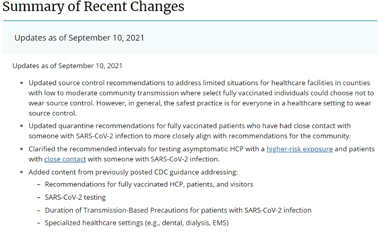 Also updated on September 10, 2021 was Interim Infection Prevention and Control Recommendations for Healthcare Personnel During the Coronavirus Disease 2019 (COVID-19) Pandemic.
