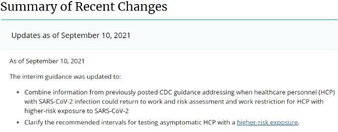 Interim Guidance for Managing Healthcare Personnel with SARS-CoV-2 Infection or Exposure to SARS-CoV-2 was updated on September 10, 2021 as well.