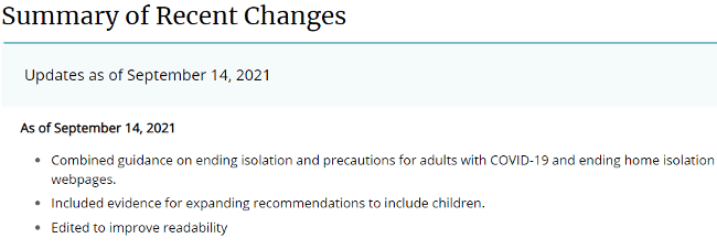 Ending Isolation and Precautions for People with COVID-19: Interim Guidancewas updated September 14, 2021.