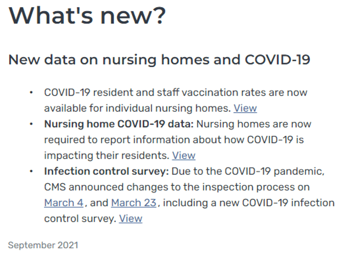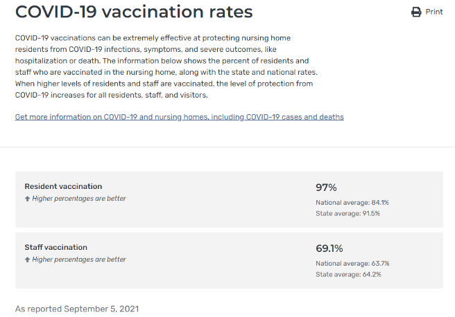 CMS announced this afternoon that nursing home resident and staff COVID-19 vaccinations are now available on Care Compare. This data was unveiled this afternoon (September 21, 2021). The reported data will be updated by CMS bi-weekly.