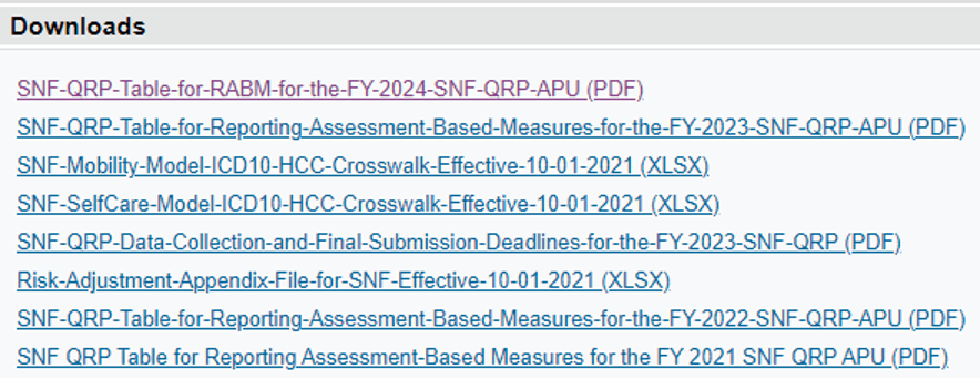 An update to the Skilled Nursing Facility Quality Reporting Program (SNF QRP) Annual Payment Update (APU) Table for Reporting Assessment-Based quality measures (QMs) and standardized patient assessment data elements to CMS is now available. This document has been updated to reflect the data elements required to meet the APU minimum data completion threshold for the Fiscal Year (FY) 2024. The document can found in the Downloads section below.