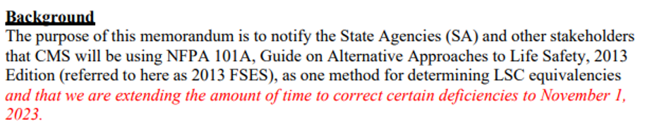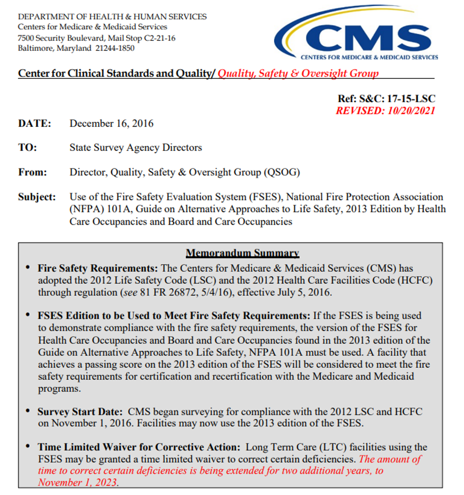 Extension of Time Limited Waiver for Corrective Action – Fire Safety Evaluation System October 22, 2021 Posted in INDUSTRY NEWS, Long-Term Care Mary Madison, RN, RAC-CT, CDPClinical Consultant – Briggs Healthcare On October 20, 2021, CMS revised S&C: 17-15-LSC: Share this: Click to share on X (Opens in new window) X Click to share on Facebook (Opens in new window) Facebook Click to share on LinkedIn (Opens in new window) LinkedIn Click to email a link to a friend (Opens in new window) Email Like Loading...