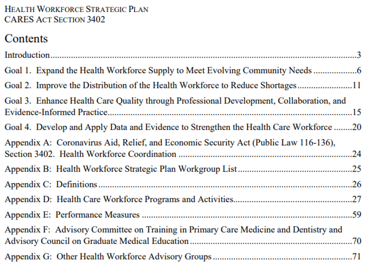 This Health Workforce Strategic Plan, required by the Coronavirus Aid, Relief, and Economic Security (CARES) Act, provides a forward-looking framework for health workforce improvements, focused on four key goals: