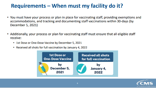 I provided the hyperlinks to the CMS slides and recorded video within my November 5, 2021 blog. Slide 6 of the slide deck shows the 1st dose or the one-dose vaccine must be received by December 5, 2021.