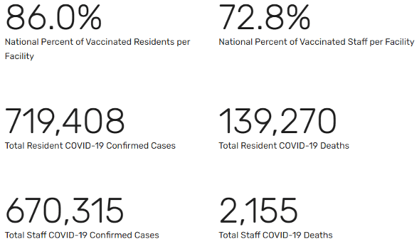 View a list of every nursing home with recent resident and staff vaccination rates and other data. There’s also a separate tab for nursing homes with a staff vaccination rate of 75% or more. Kudos to the facilities that are identified on that tab. Keep up the good work – everyone!