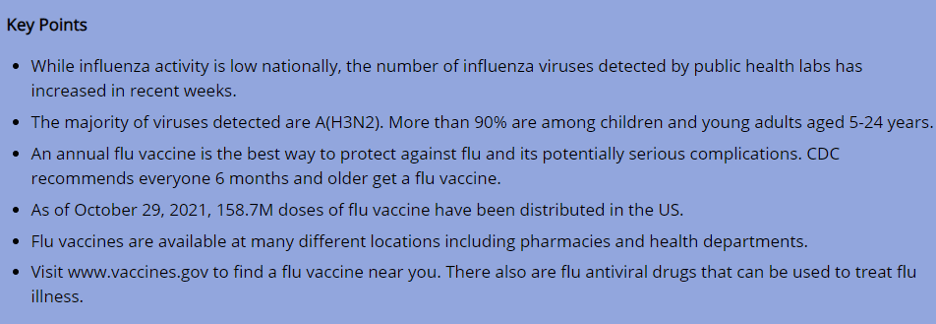 Because the flu is starting to ramp up, I’m including and will be including weekly CDC flu data reports. Key updates for week ending November 6, 2021 include: